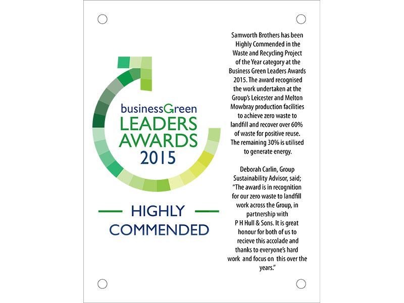 Samworth Brothers has been Highly Commended in the Waste and Recycling Project of the Year category at the Business Green Leaders Awards 2015. The award recognised the work undertaken at the Group's Leicester and Melton Mowbray production facilities to achieve zero waste to landfill and recover over 60% of waste for positive reuse. The remaining 30% is utilised to generate energy.